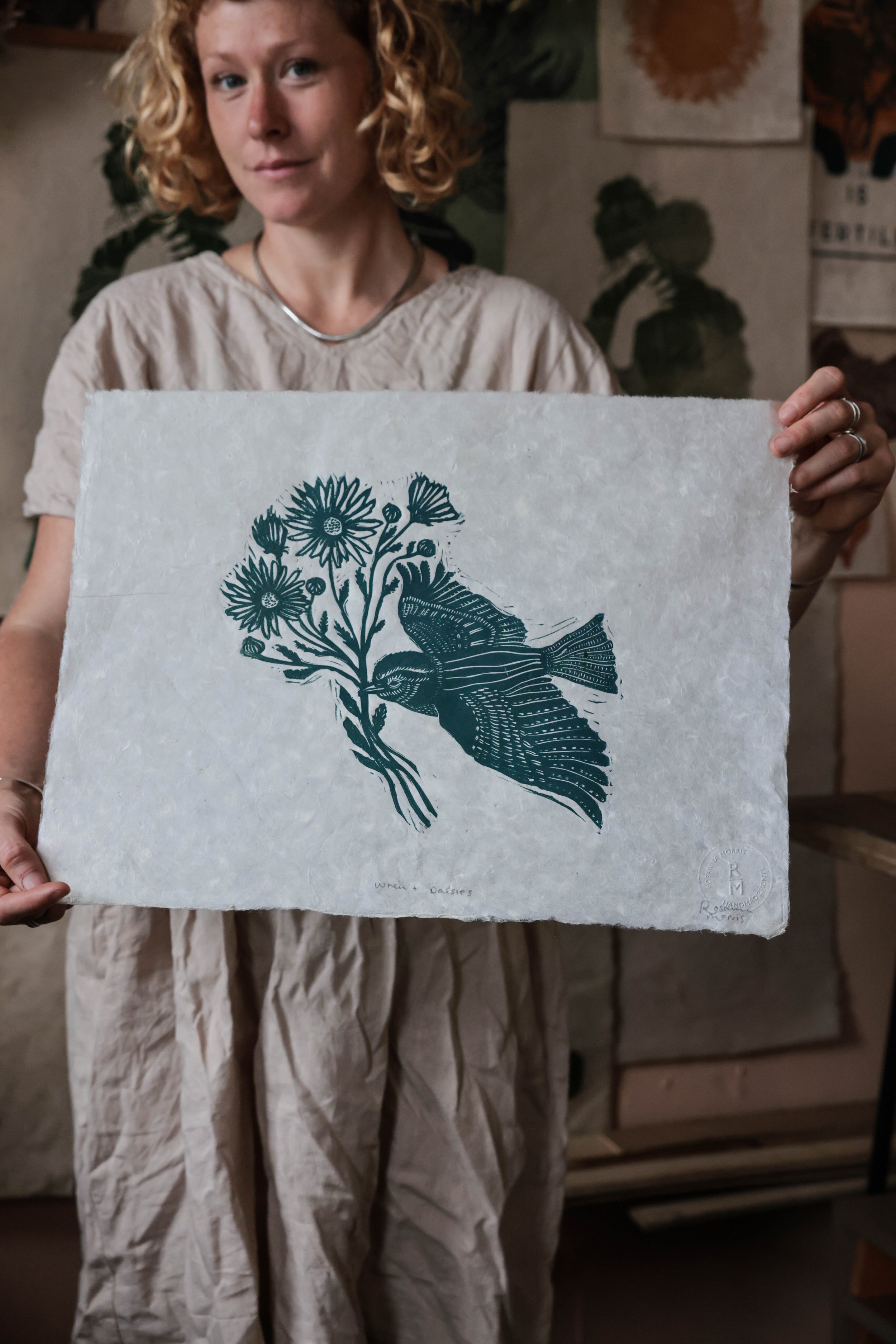 This Relief print is part of an open edition, the order is just for the print shown on handmade paper does not come with wooden magnet hanger. All my designs are carved and printed by hand and every single one of them is a unique reproduction. Naturally subtle variations in the inking and finish will occur from print to print, when you buy a hand pulled print you are choosing these subtle variations over digital reproductions.